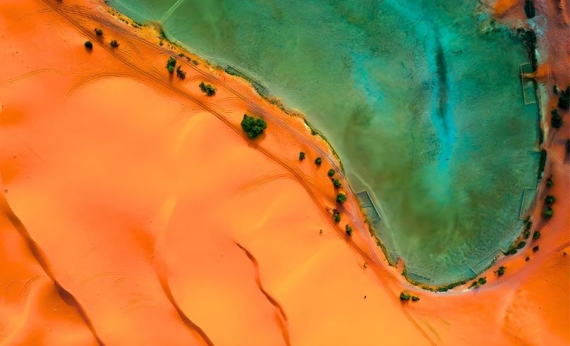 Near Al Ahsa’s vast oasis system, Al-Asfar Lake appears and retracts with rainfall cycles and groundwater shifts. When full, it spreads into a pale green-blue sheet across the desert floor. As evaporation intensifies, it fragments into shallow pools and then vanishes entirely into sand. Its colour is never stable—sometimes algae-rich green, sometimes dusty turquoise, sometimes reflective silver after storms.
